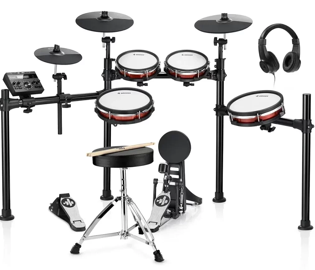 Das DED-200 MAX wird als Komplettpaket mit allen erforderlichen Komponenten geliefert: klappbarer Eisenmetallständer mit 4-Pin-Aluminiumrahmen, Hi-Hat-Steuerpedal, Bassdrum-Pedal, Drum Chair, Kopfhörer und Drumsticks. Dank dieser Stabilität und Vielseitigkeit eignet sich das Kit sowohl für das Üben zu Hause als auch für Bühnenauftritte.