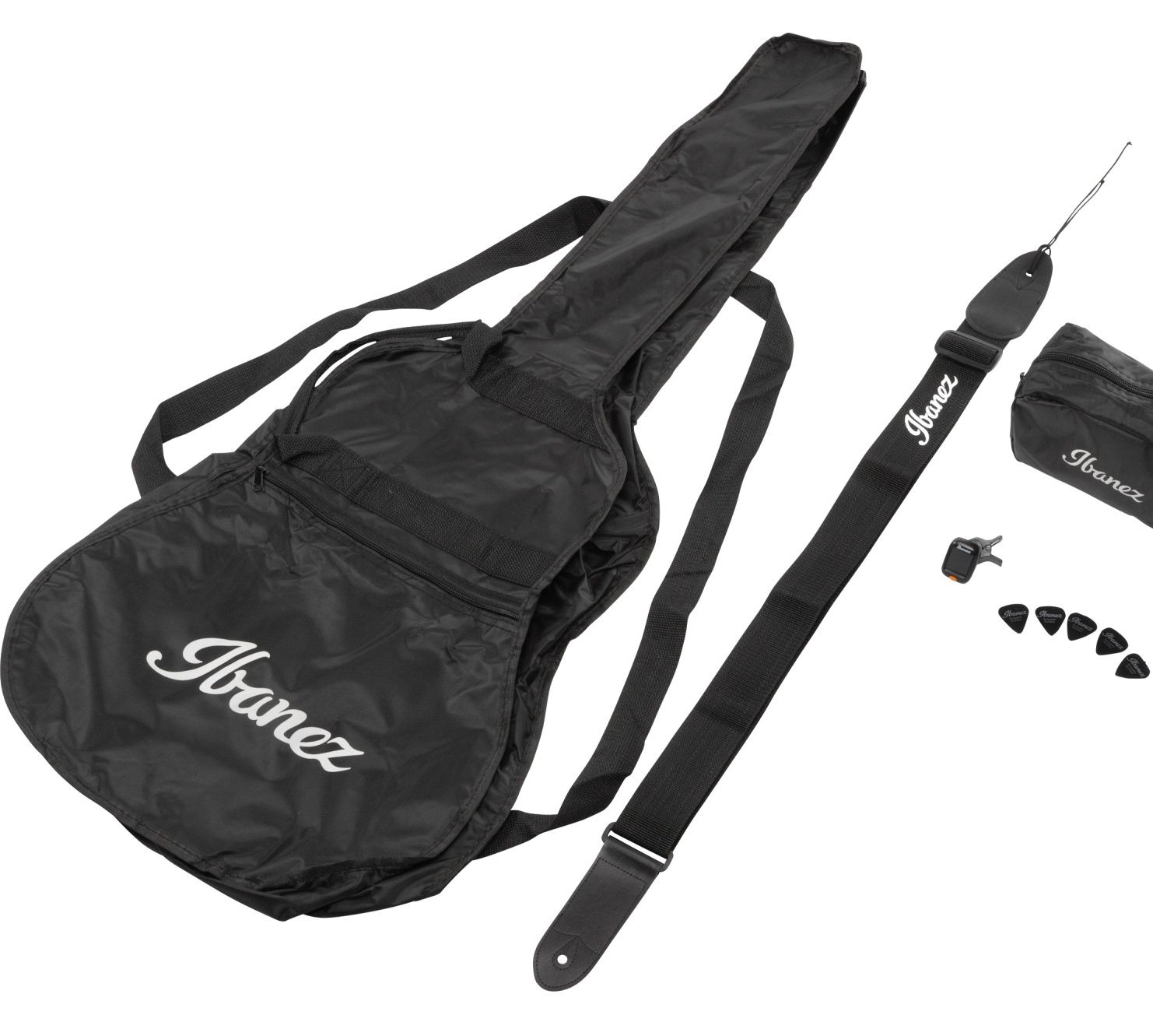 Paket bestehend aus Gitarre, einfacher Tasche, Nylongurt und Anklemmtuner